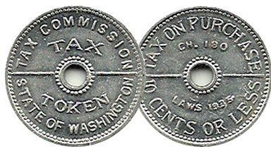 Sales tax tokens, also known as pennywise tax takers, were small fractional cents devices used in several American states throughout the early years of the Great Depression to cover sales tax for purchases of goods in the stores. Sales tax tokens had the same purpose as they do today, that is to collect taxes for the state. These pennies, also called tax dimes, were printed with the symbol five on the reverse side. This was done to help the tax man collect the money.